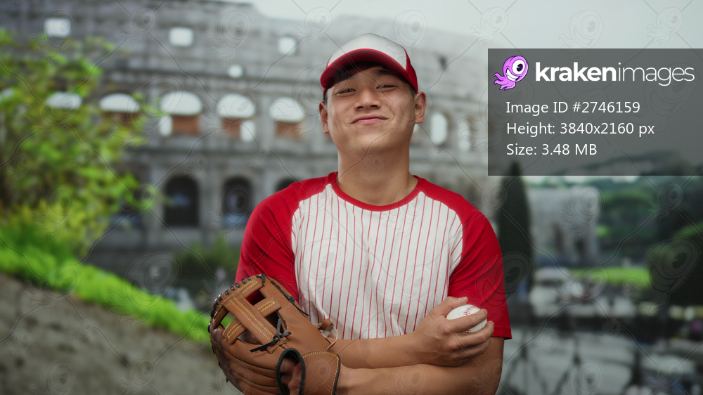 Young chinese man in a baseball uniform smiling confidently near the ancient roman coliseum in a vibrant city setting outdoors.
