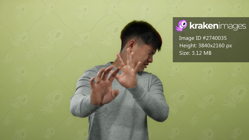 Young chinese man in a gray sweater reacts with discomfort against an isolated yellow background, emphasizing his expressive body language.
