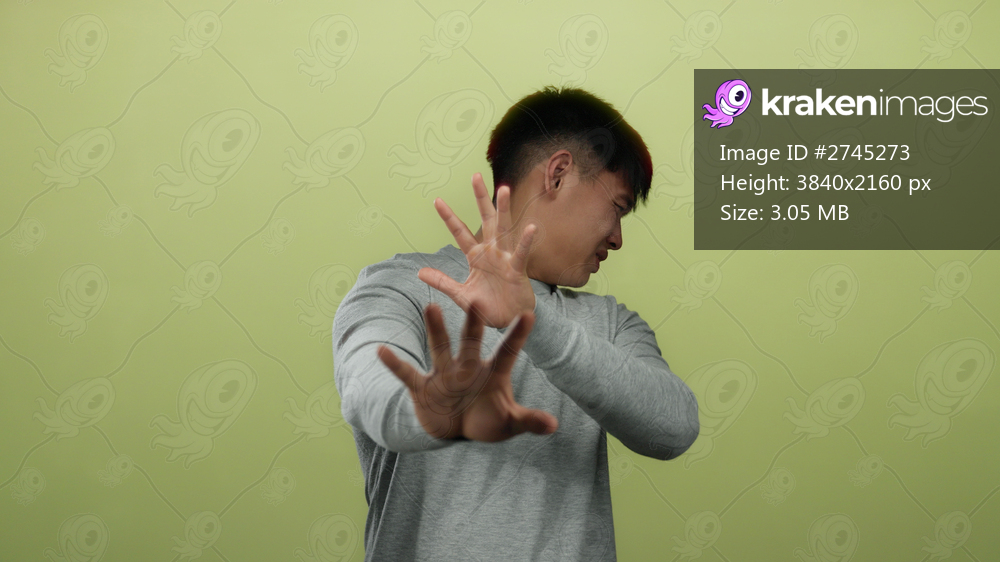 Young chinese man in a gray sweater reacts with discomfort against an isolated yellow background, emphasizing his expressive body language.