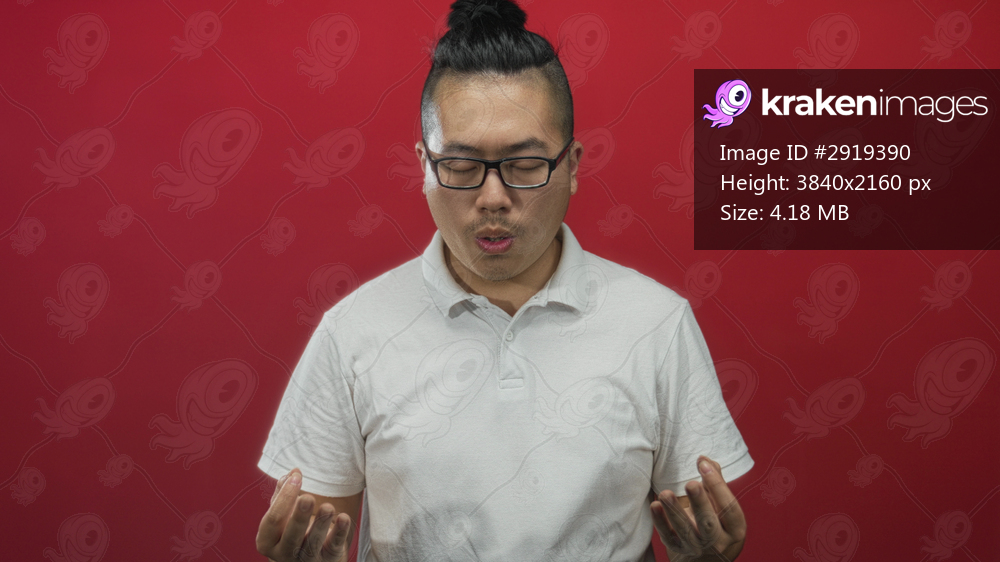 Young chinese man in a white polo with open palms and closed eyes standing in a red studio hands raised in prayer gesture; mindfulness meditation serenity. - Kraken Images