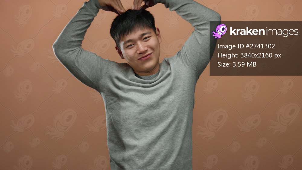 Young chinese man in casual sweater posing playfully against an isolated brown background wall, expressing joy and positivity.