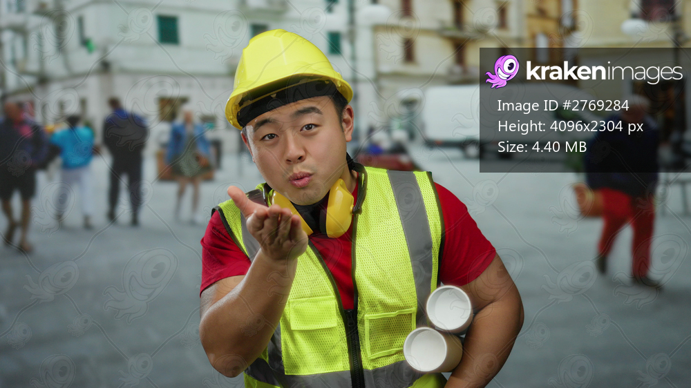 Young chinese man in construction gear holds blueprints and gestures a kiss in a bustling urban street setting.