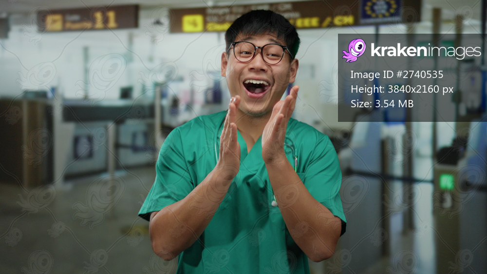 Young chinese man in green medical scrubs clapping at an airport terminal indoors with signs in the background.