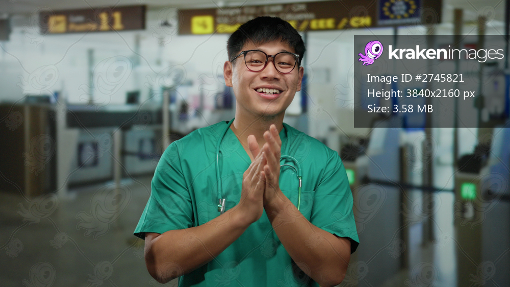 Young chinese man in green medical scrubs clapping at an airport terminal indoors with signs in the background.