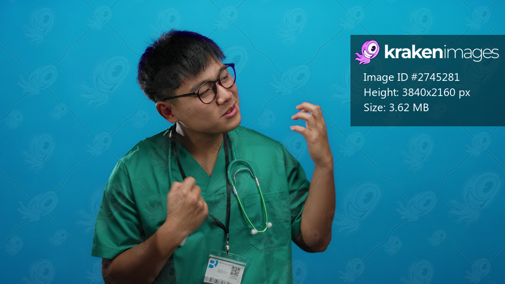 Young chinese man in green scrubs playfully mimics playing air guitar against a vibrant blue wall, wearing glasses and a stethoscope, exuding playful energy. - Kraken Images