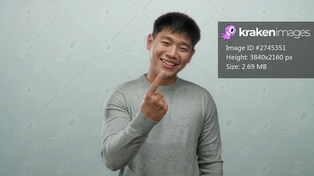 Young chinese man in grey sweater over isolated white background expressing gestures with hands, smiling with positivity.