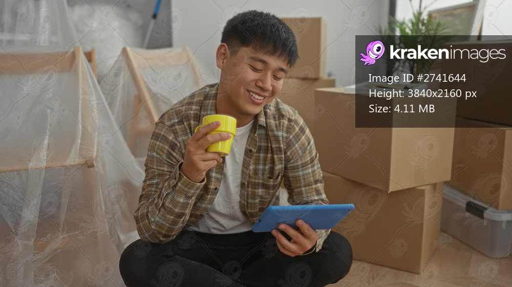 Young chinese man in new home enjoying coffee and using tablet in living room surrounded by moving boxes and protected furniture indicating recent relocation - Kraken Images