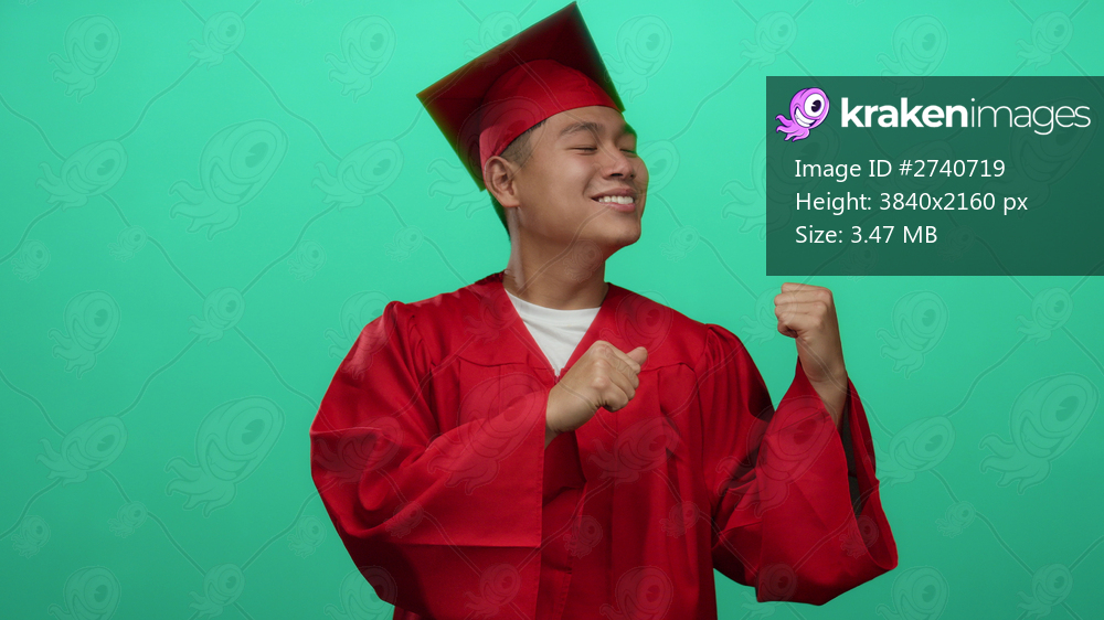 Young chinese man in red graduation attire celebrating against a green background, showcasing a sense of achievement and joy.