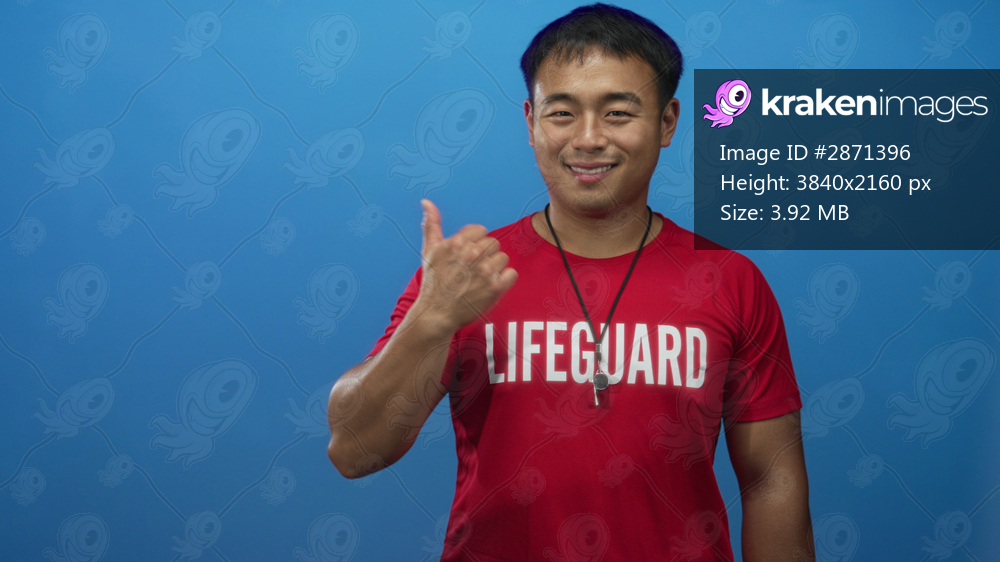 Young chinese man in red lifeguard shirt holding a whistle gives thumbs up in blue studio; confidence.
