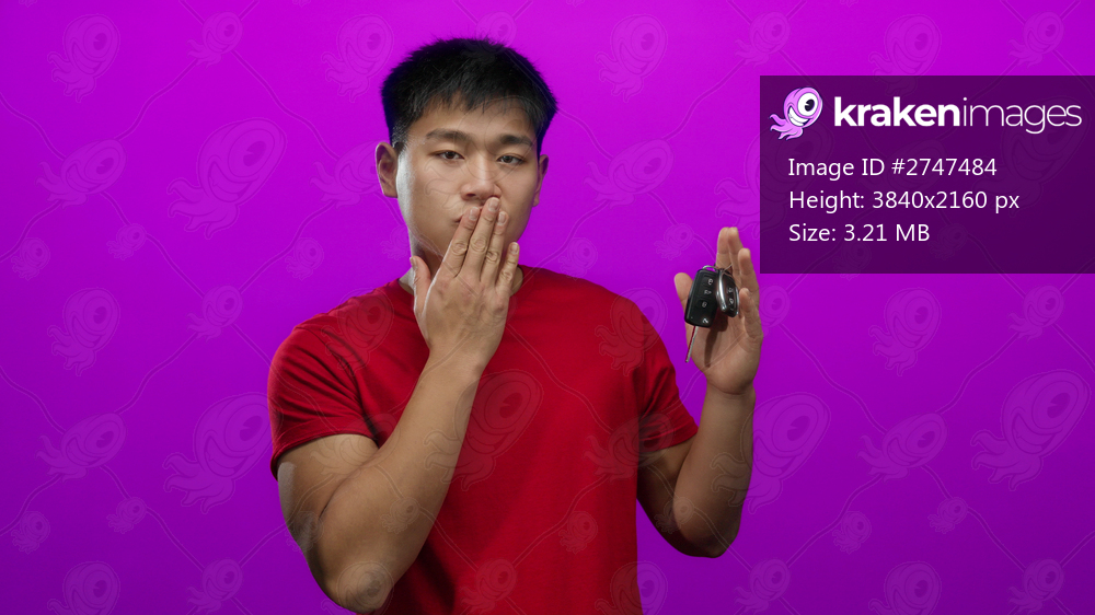 Young chinese man in red shirt blowing kiss with car keys in hand against isolated pink background conveying affection and transportation.