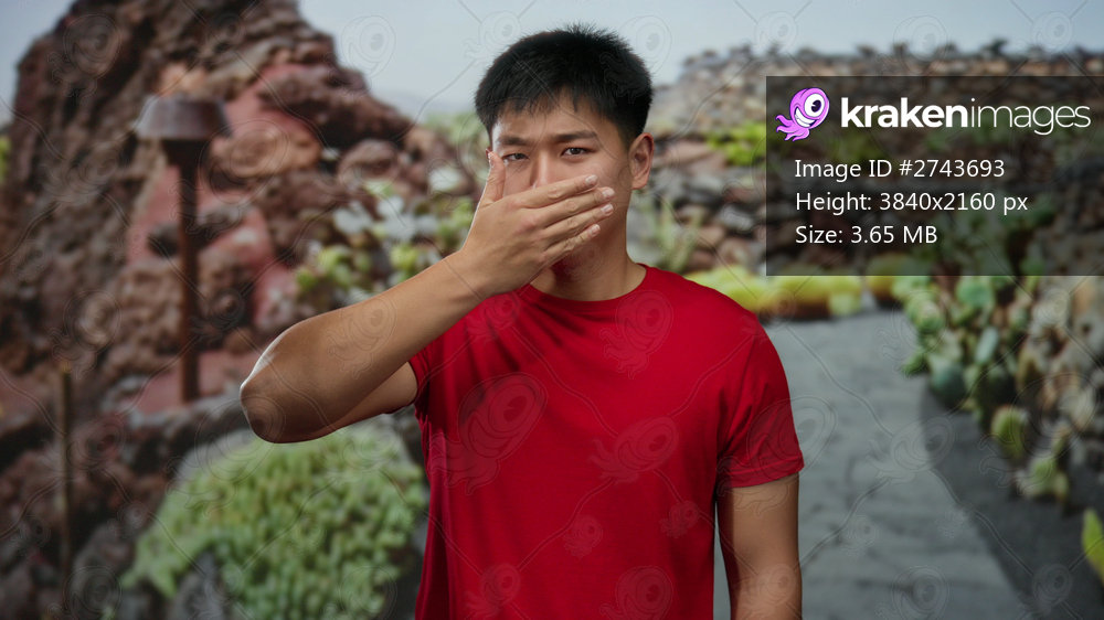 Young chinese man in red shirt covers eyes with hand while standing outdoors in a scenic rocky park pathway.