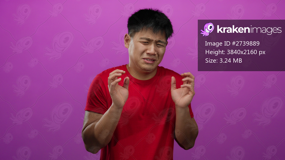 Young chinese man in red shirt expressing a scared emotion against an isolated pink wall background in a well-lit studio setting.