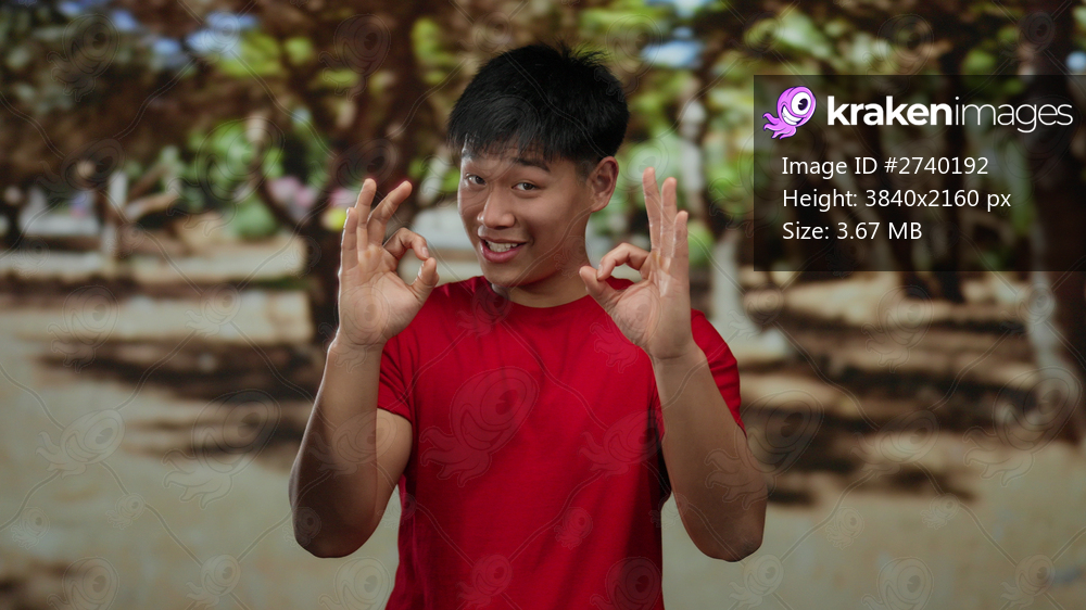 Young chinese man in red shirt making okay gesture in outdoor park setting.
