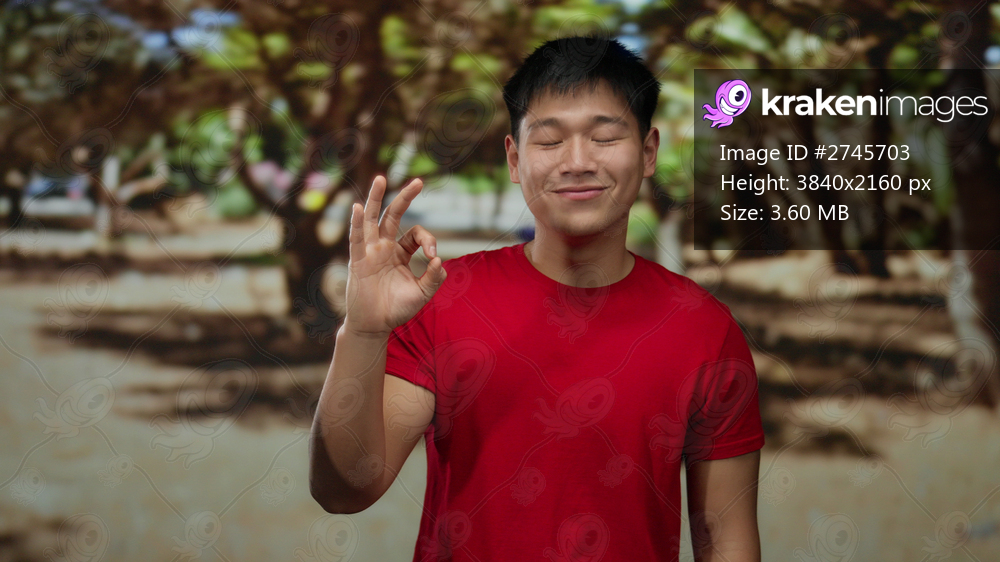 Young chinese man in red shirt making okay gesture in outdoor park setting.