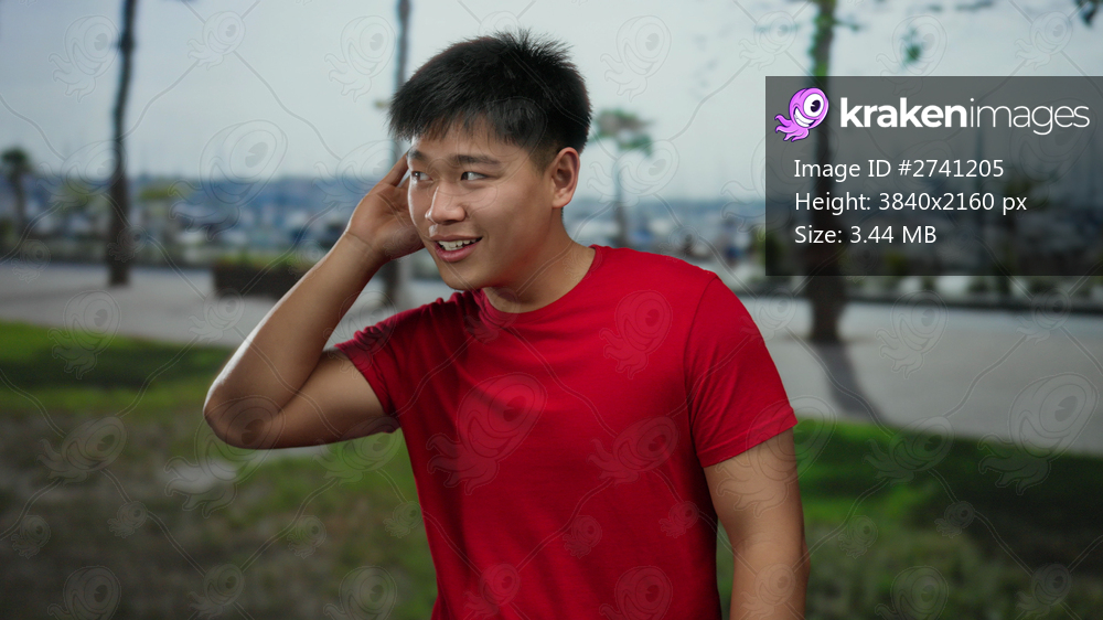 Young chinese man in red shirt smiles and listens outdoors on a city street under a bright sky, enjoying the urban environment.
