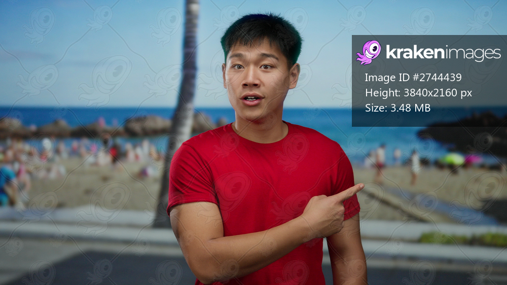 Young chinese man in red shirt smiles and points with thumbs up at beachside setting with blue sea and palm tree, suggesting a lively seaside atmosphere. - Kraken Images