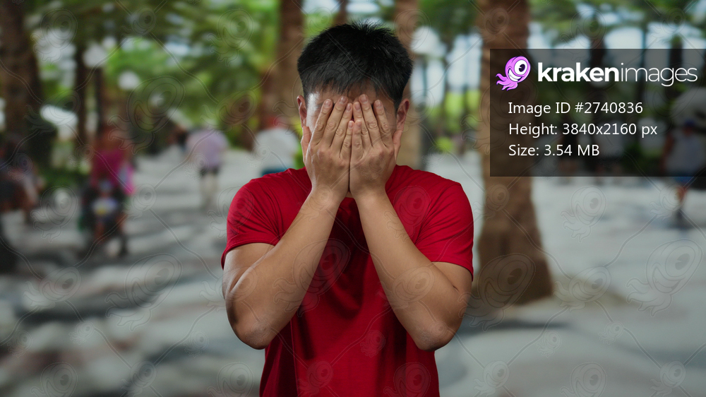 Young chinese man in red shirt surprised in a vibrant park setting, surrounded by blurred people and lush trees, capturing a joyful outdoor moment.