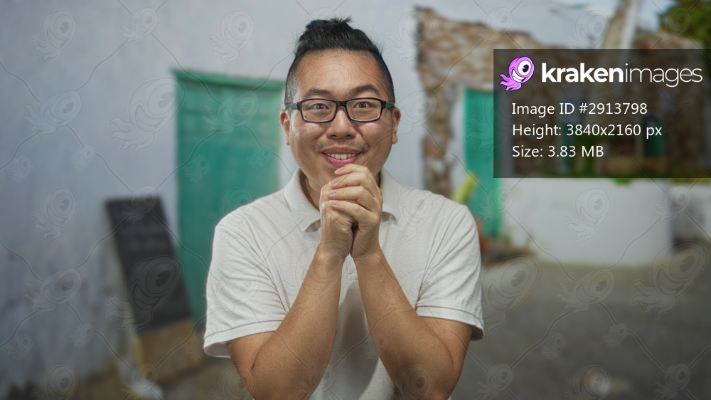 Young chinese man in white polo with glasses, hands clasped near chin on a street by stone building and green door; gratitude prayer.