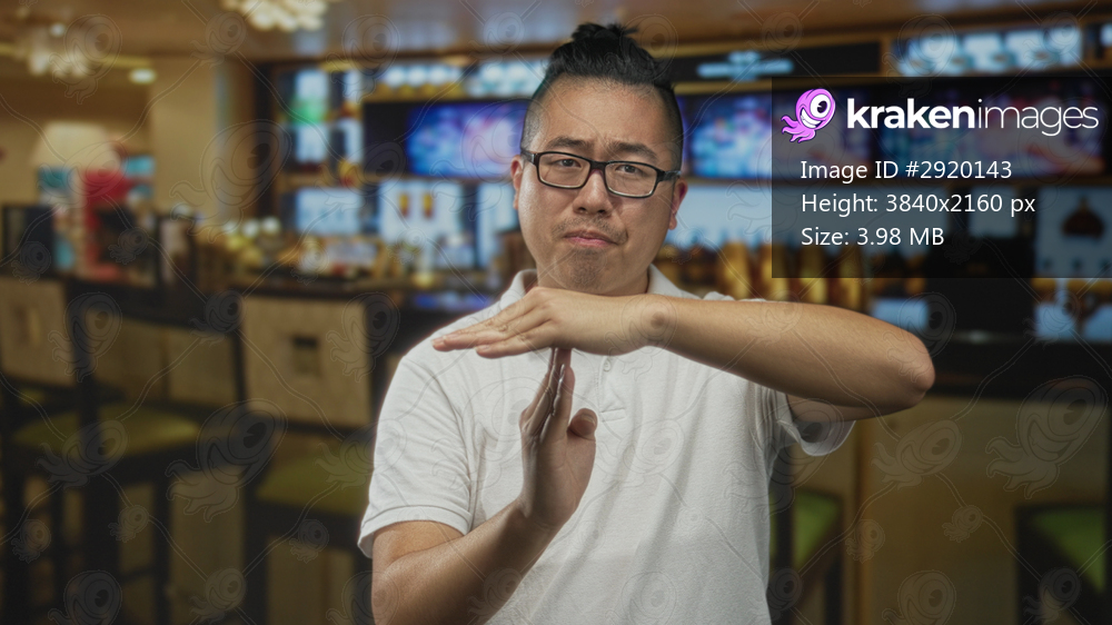 Young chinese man in white polo and glasses making hands forming time out gesture in restaurant building; boundary firmness.