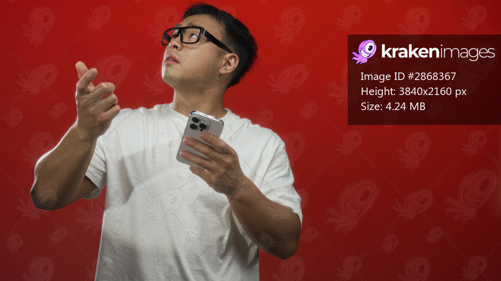 Young chinese man in white shirt holding smartphone points finger to phone in red studio; concentration.