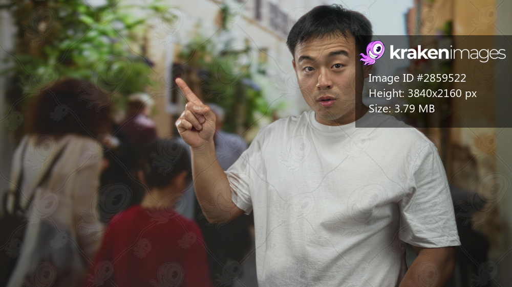 Young chinese man in white shirt points finger to steel framework on building under construction; determination.