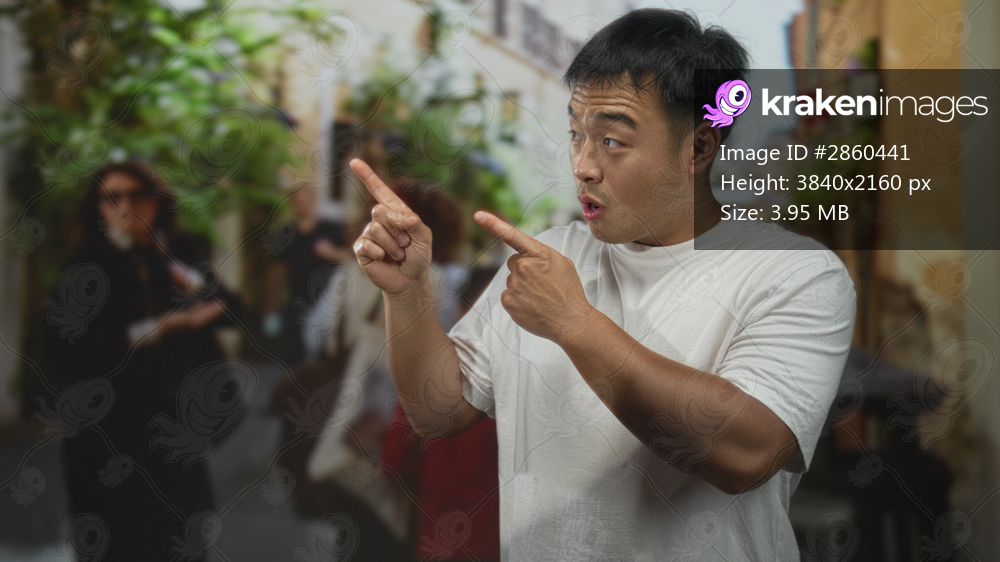 Young chinese man in white shirt points finger to steel framework on building under construction; determination.