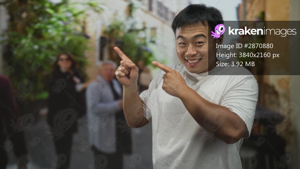 Young chinese man in white shirt points finger to steel framework on building under construction; determination.