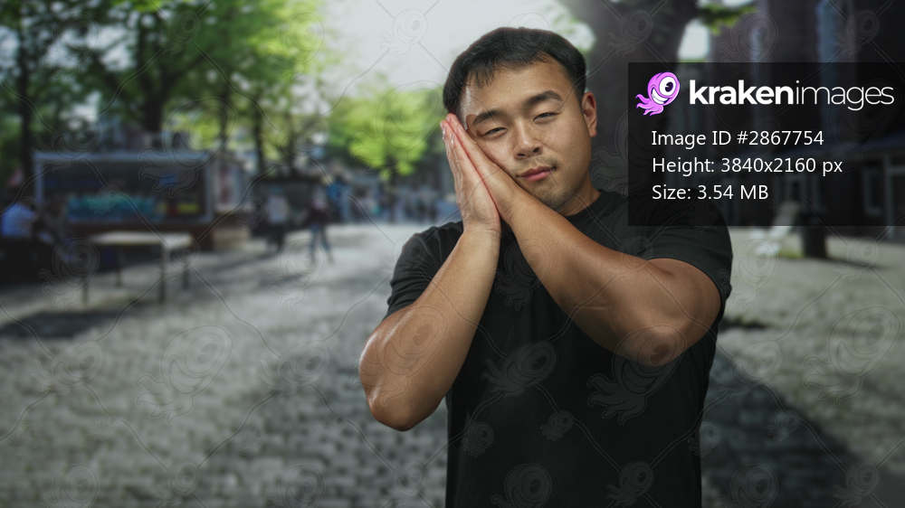 Young chinese man leaning with hands pressed together under cheek for sleep gesture on sunny cobblestone street lined with trees; serenity.