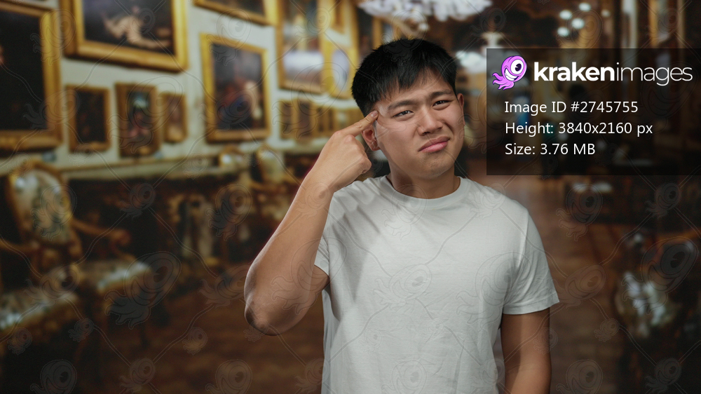 Young chinese man making a puzzled gesture indoors at a museum with ornate art in the background, wearing a white shirt, creating a humorous or confused atmosphere. - Kraken Images