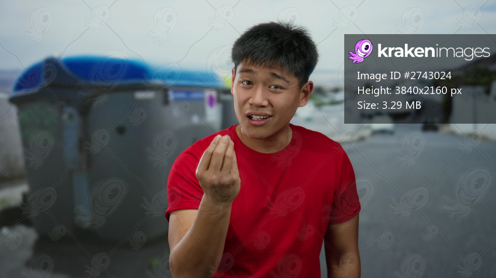 Young chinese man outdoors on city street gesturing with emotion against urban background in red shirt near dumpster