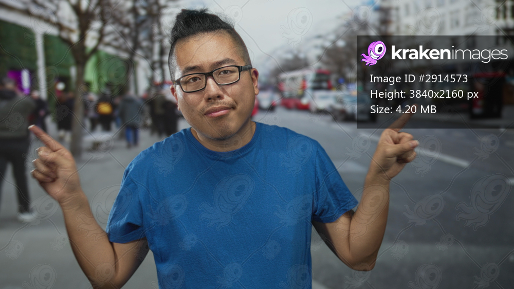 Young chinese man pointing both index fingers on city street near bus and pedestrians wearing blue t shirt with smirk and closed eyes; playful doubt.