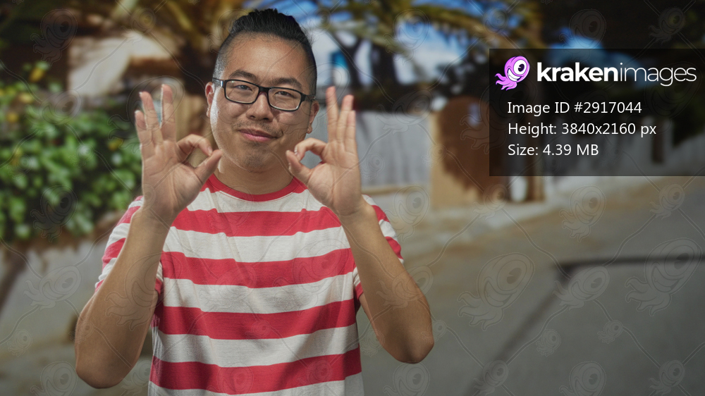 Young chinese man pointing both index fingers toward camera, smiling, wearing red striped t shirt on a sunlit residential street; playful confidence.
