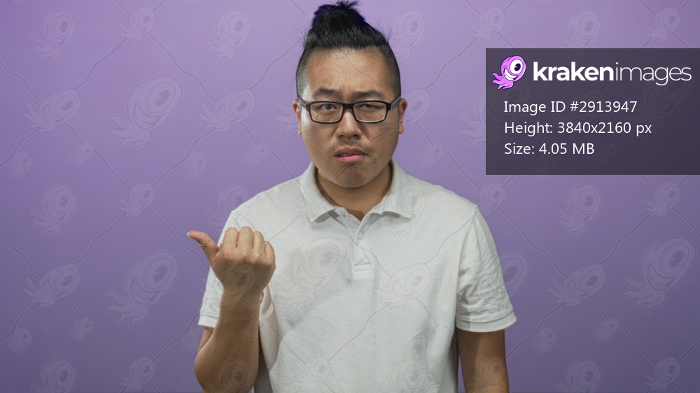 Young chinese man pointing thumb over shoulder showing hand and unsure expression in a purple studio; doubt.