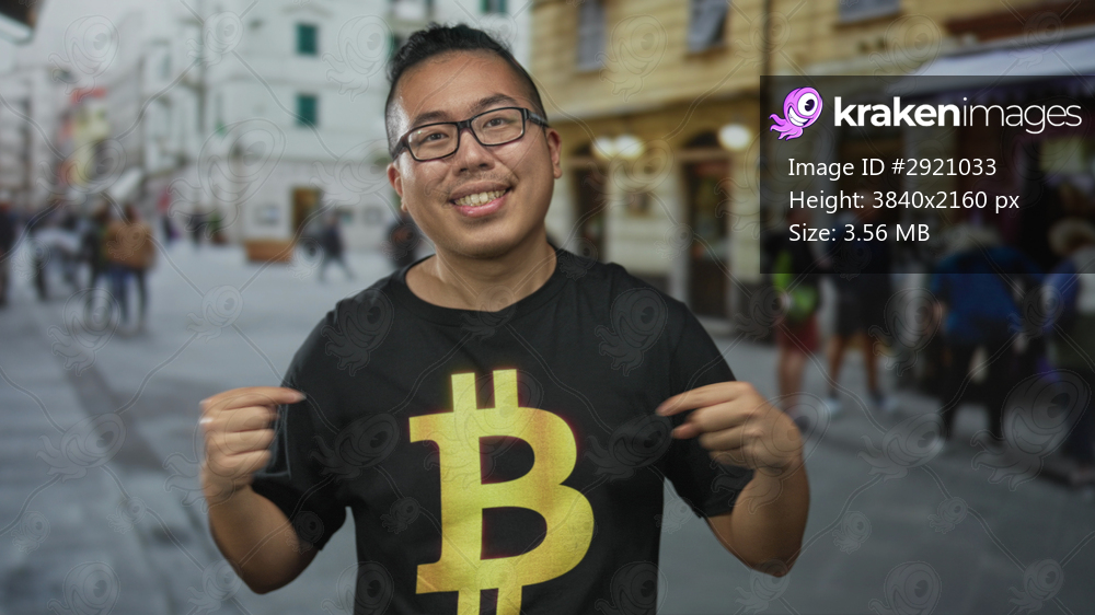 Young chinese man points finger at large gold bitcoin logo on black t shirt in busy street with blurred pedestrians; crypto pride.