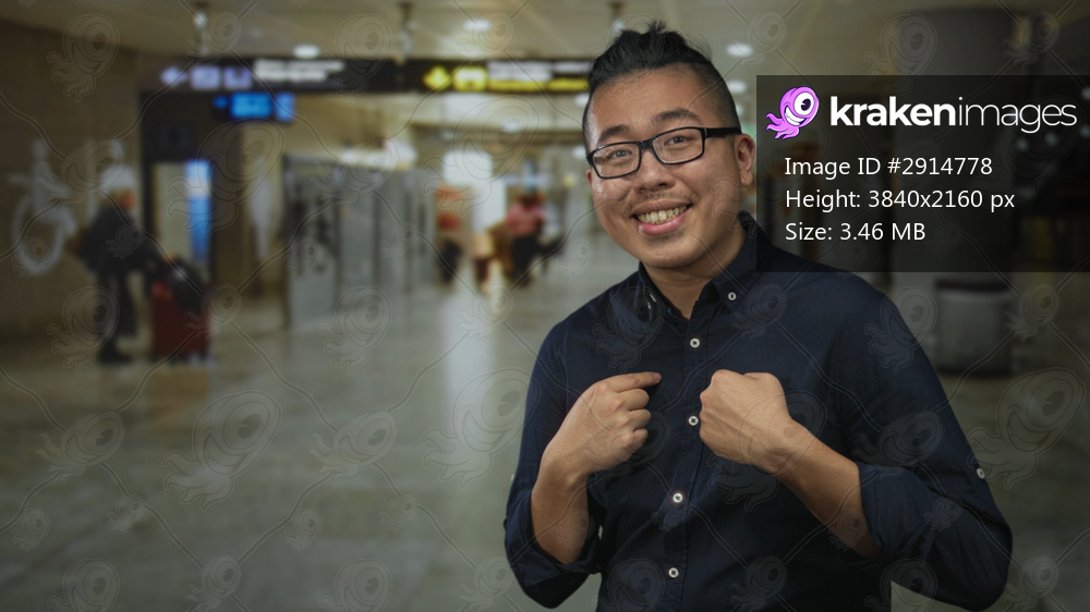 Young chinese man points finger to chest in busy airport terminal near luggage and signage; awkwardness self doubt.
