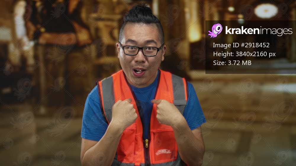 Young chinese man points to chest wearing bright orange reflective safety vest inside church building aisle; pride duty.