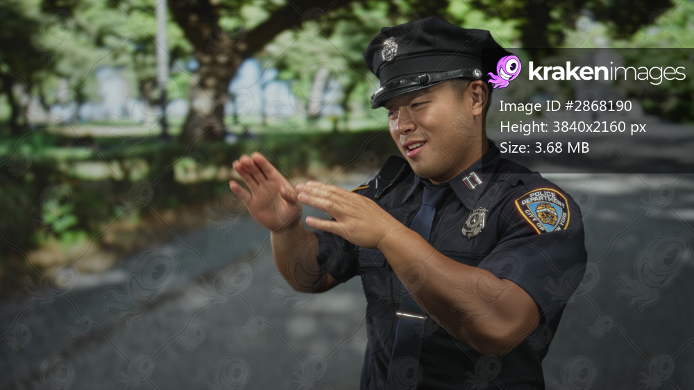 Young chinese man police officer smiling, dancing and pointing finger in green park with sunlit trees; pride duty.