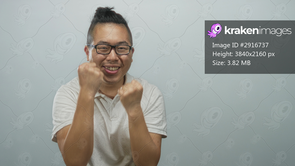 Young chinese man with raised fists and glasses smiling in pale blue studio; joy celebration victory.