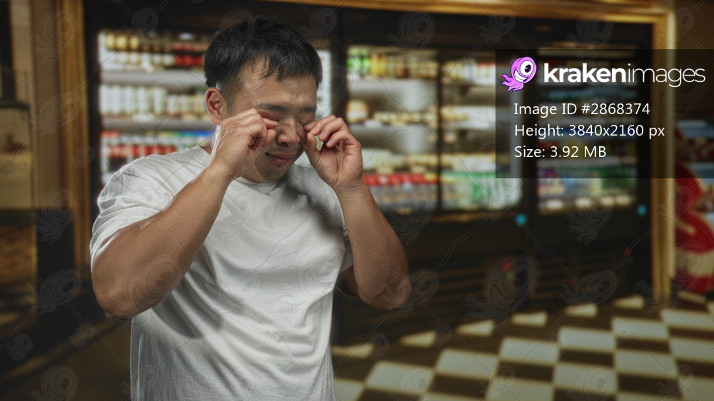 Young chinese man rubbing eyes inside a restaurant with refrigerated shelves and checkered tile floor; fatigue.
