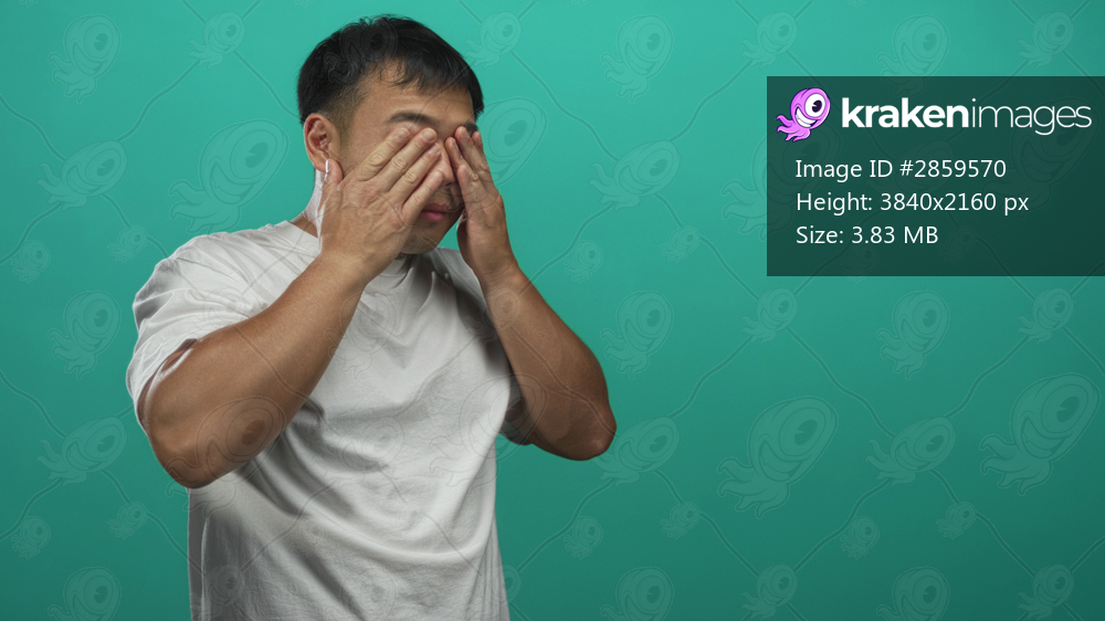 Young chinese man rubbing his eyes while wearing a white t shirt in a teal green studio portrait conveying clear discomfort; fatigue.