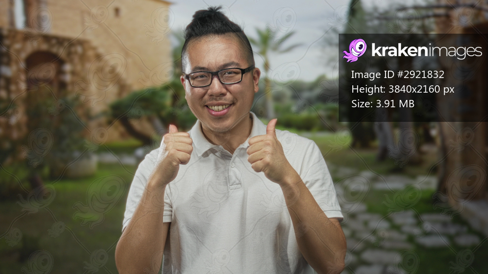 Young chinese man shows thumbs up with visible hands in front of stone building in park; approval optimism.