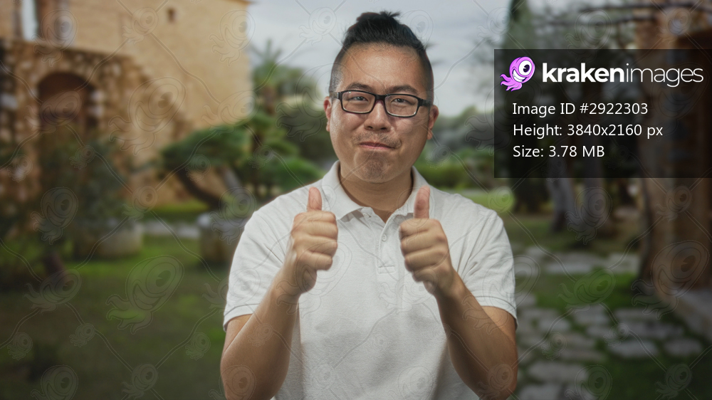 Young chinese man shows thumbs up with visible hands in front of stone building in park; approval optimism.