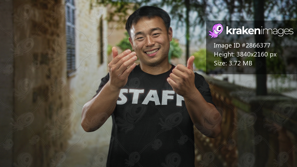 Young chinese man shows thumbs up wearing staff shirt on sunny street lined with stone walls; approval.