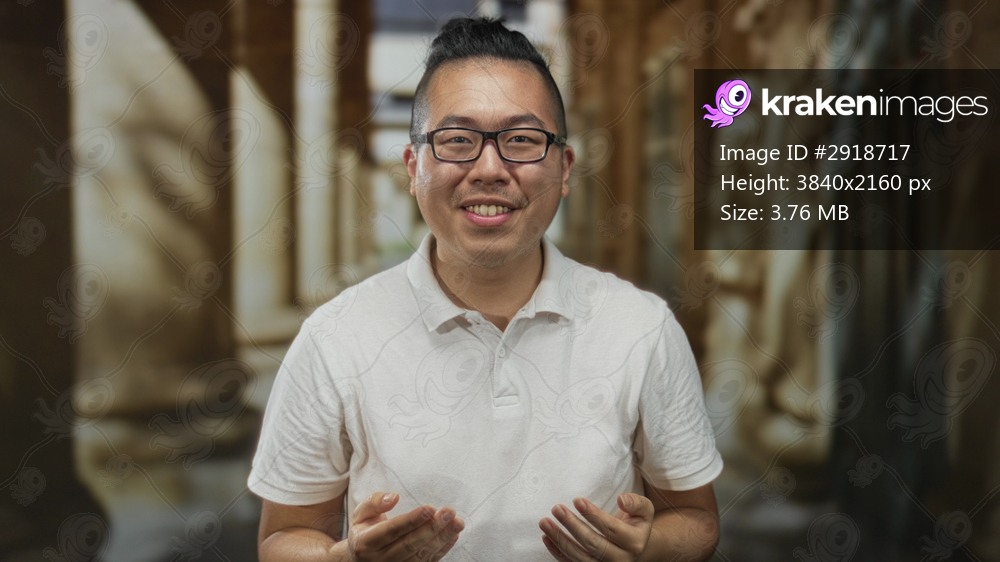 Young chinese man smiling with bare hands extended toward camera in building corridor of old town; welcoming warmth.