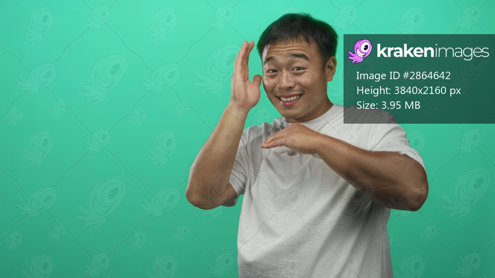 Young chinese man smiling frames view with hands in green studio, looking directly at the lens; curiosity wonder imagination creativity.