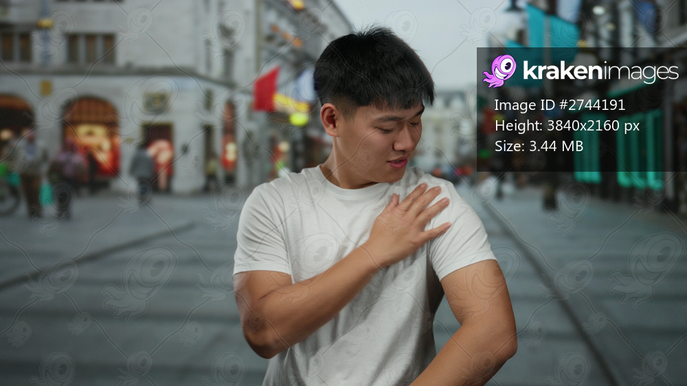 Young chinese man smiling and gesturing on a lively city street in an urban outdoor setting.