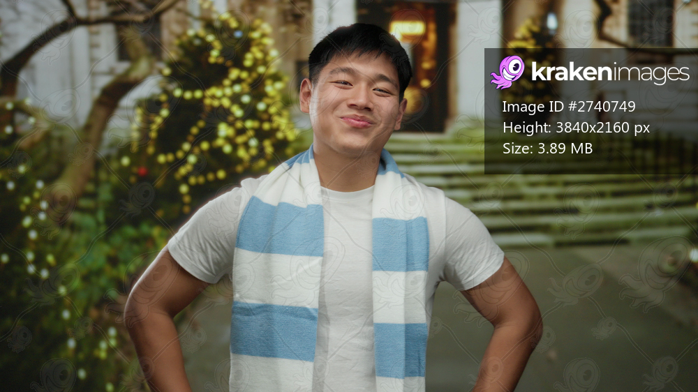 Young chinese man smiling outdoors on a city street with festive lights and trees, dressed warmly with a scarf, embodying winter joy and holiday spirit in an urban setting. - Kraken Images