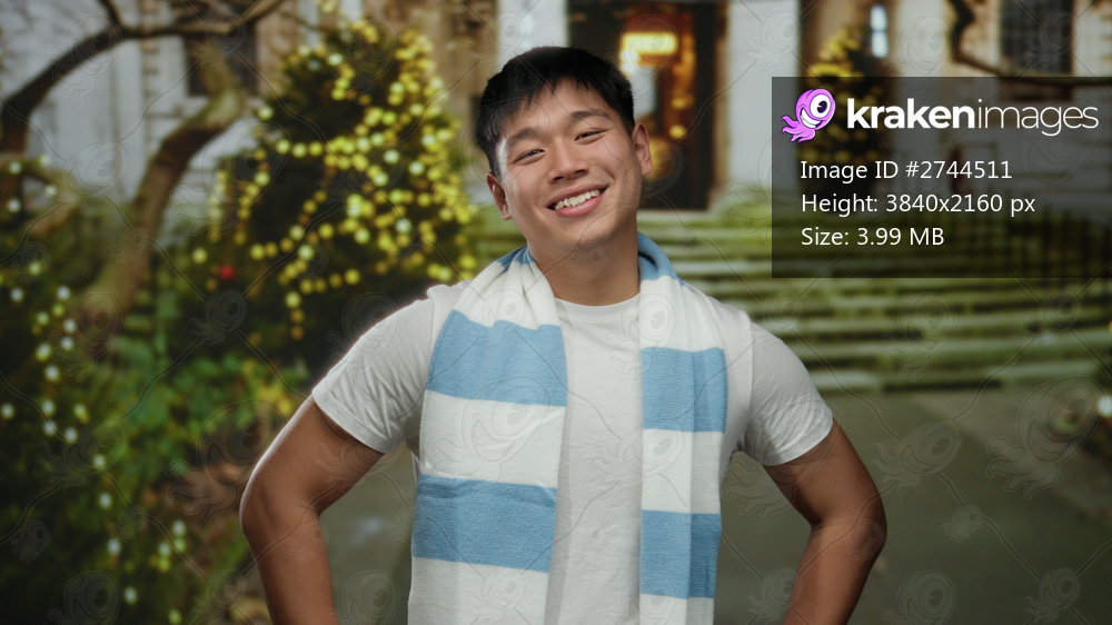 Young chinese man smiling outdoors on a city street with festive lights and trees, dressed warmly with a scarf, embodying winter joy and holiday spirit in an urban setting. - Kraken Images