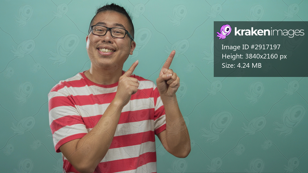 Young chinese man smiling and pointing both index fingers in studio, wearing red striped shirt and glasses against teal backdrop; joy enthusiasm.