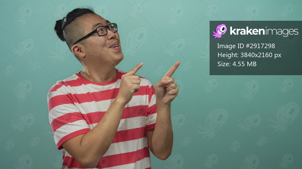 Young chinese man smiling and pointing both index fingers in studio, wearing red striped shirt and glasses against teal backdrop; joy enthusiasm.